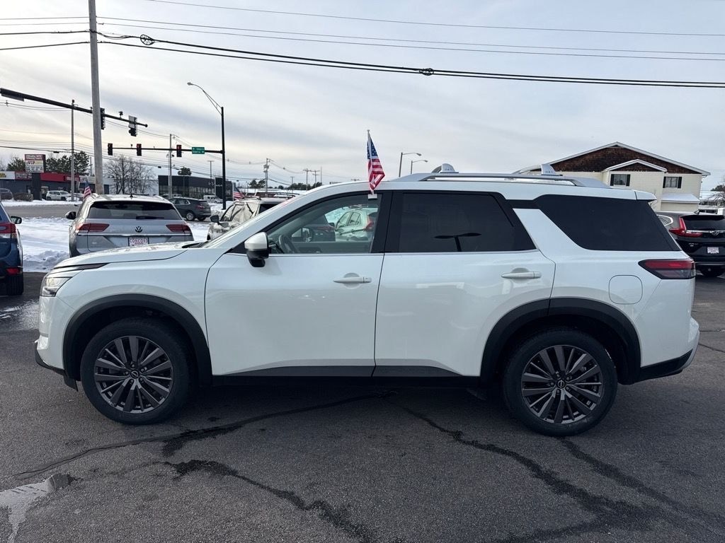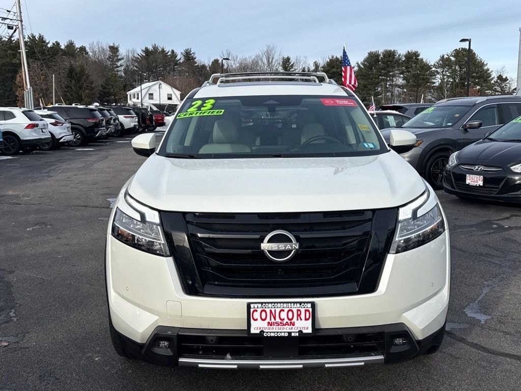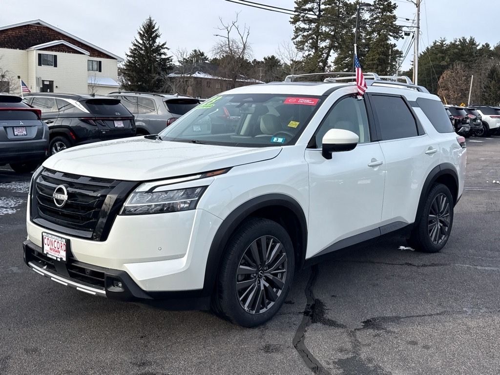 Pearl White Tricoat 2023 Nissan Pathfinder SL 4WD 9-Speed Automatic V6 CARFAX One-Owner. Clean CARFAX. Pathfinder SL, 4D Sport Utility, 9-Speed Automatic, 4WD, Pearl White Tricoat, Light Gray Leather, 20" Painted Alloy Wheels, 2nd-Row Captain Chairs, 2nd-Row Removable Center Console, Black Appearance Package, Black Grille (K10), Black Liftgate Emblems, Bose Premium Audio System, Cross Bars, Electronic Stability Control, Exterior Parking Camera Rear, Garage door transmitter: HomeLink, Heated door mirrors, Heated Front Bucket Seats, Heated Rear Seats, Illuminated entry, Illuminated Kick Plate, Leather Seating Surfaces, LED Fog Lamps, Lighting Package (N92), Low tire pressure warning, Navigation system: NissanConnect Navigation, Panoramic Moonroof, Pathfinder Wordmark, Power door mirrors, Power driver seat, Power Liftgate, Remote keyless entry, Security system, SL Premium Package, Spoiler, Tow Hitch Receiver & Harness, Traction control, Turn signal indicator mirrors, Welcome Lighting.
